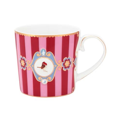 Caneca pequena listrada em rosa e vermelho do design favorito de todos os tempos da Pip: Love Birds. A caneca possui elementos decorativos dourados, design listrado elegante e um medalhão com um passarinho no meio. A caneca tem capacidade de 150ml e é decorada com elementos luxuosos como o acabamento em fios de ouro.