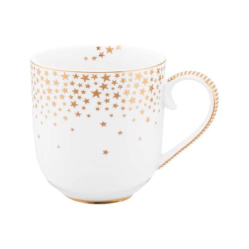 A caneca branca é decorada com estrelas de vários tamanhos e a alça é decorada com listras douradas. Esta caneca também está disponível em uma versão grande que pode ser perfeitamente combinada para um efeito lúdico na sua mesa.