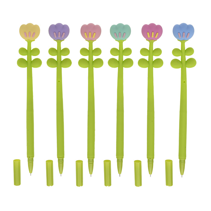 Caneta gel no formato de flor, com escrita de 0,5mm, na cor preta.