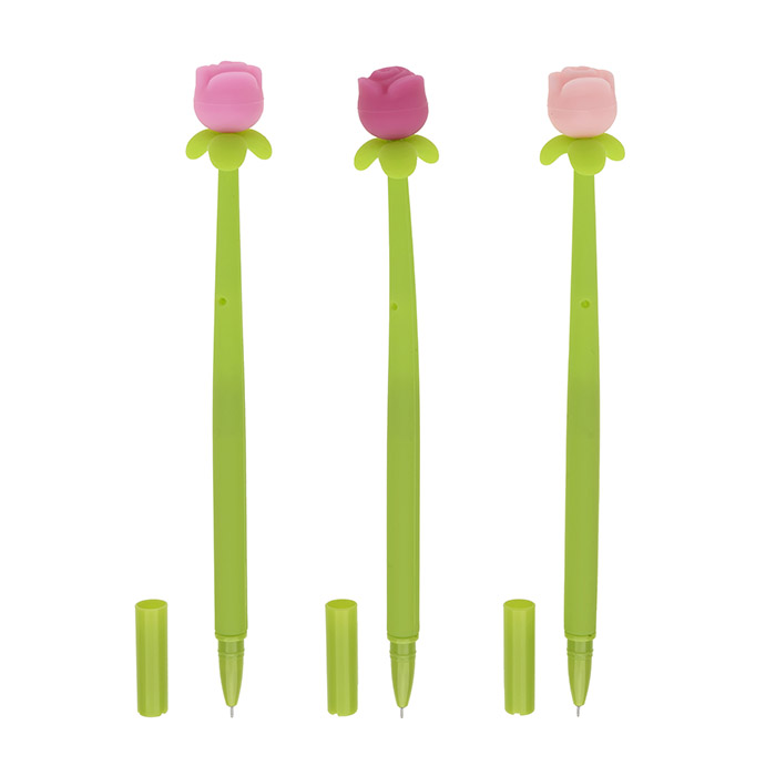 Caneta gel no formato de flor, com escrita de 0,5mm, na cor preta.