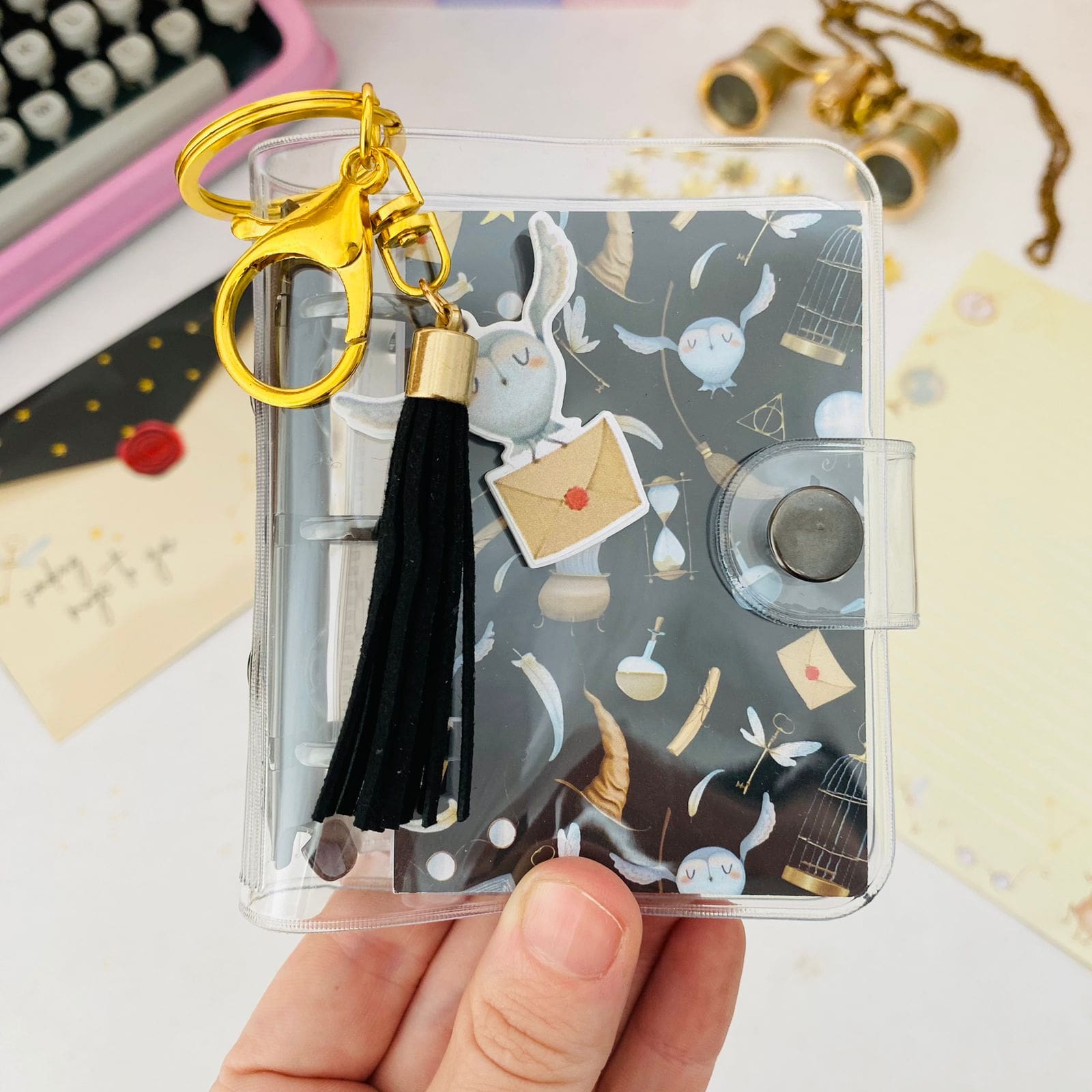 Combinando funcionalidade e estilo, eles podem ser usados como chaveiros na sua bolsa ou mochila. Além disso, os fichários vêm com uma cartela de adesivos para personalizar e decorar o próprio fichário e outras superfícies, 4 porta cartões e porta documento.