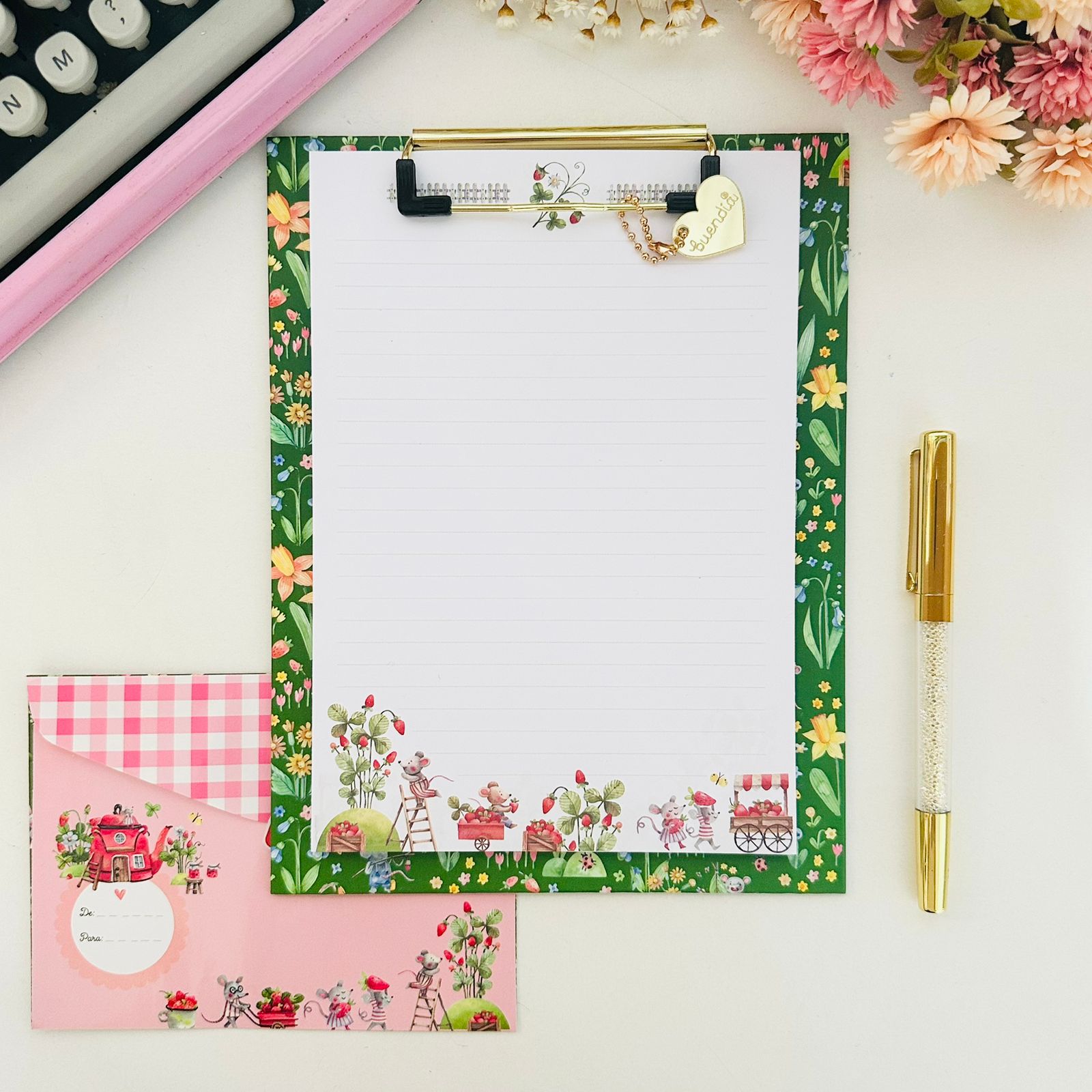 Prancheta Estampada A5 + 30 Folhas Decoradas – Fazenda de Morangos